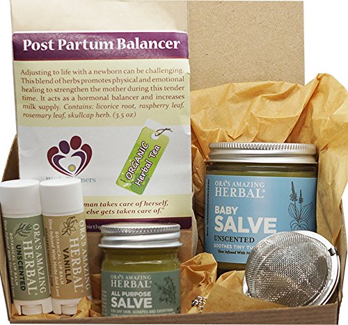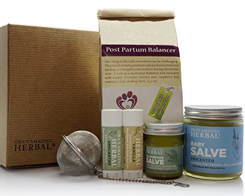 This collaborative gift box sends the perfect nurturing well wishes that a new mom and baby need. Herbal Balancer tea is formulated by midwives with organic, fair trade and kosher herbs known for their hormone balancing, mineral density, and soothing properties. Helps promote moms recovery and relaxed bonding time with new baby. Lip Balm packaging is BPA free. No synthetic fragrance or ingredients. Gift box is 100% recycled and glass jars are reusable. Ora's Amazing Herbal is a family owned business that is proud to be ethically run and sustainably operated.Feature