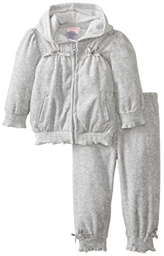 -. Feature : Two-piece set featuring hooded zip-front jacket and matching elastic-waist pant / Smocked cuffs and hem / Sparkly bow appliques