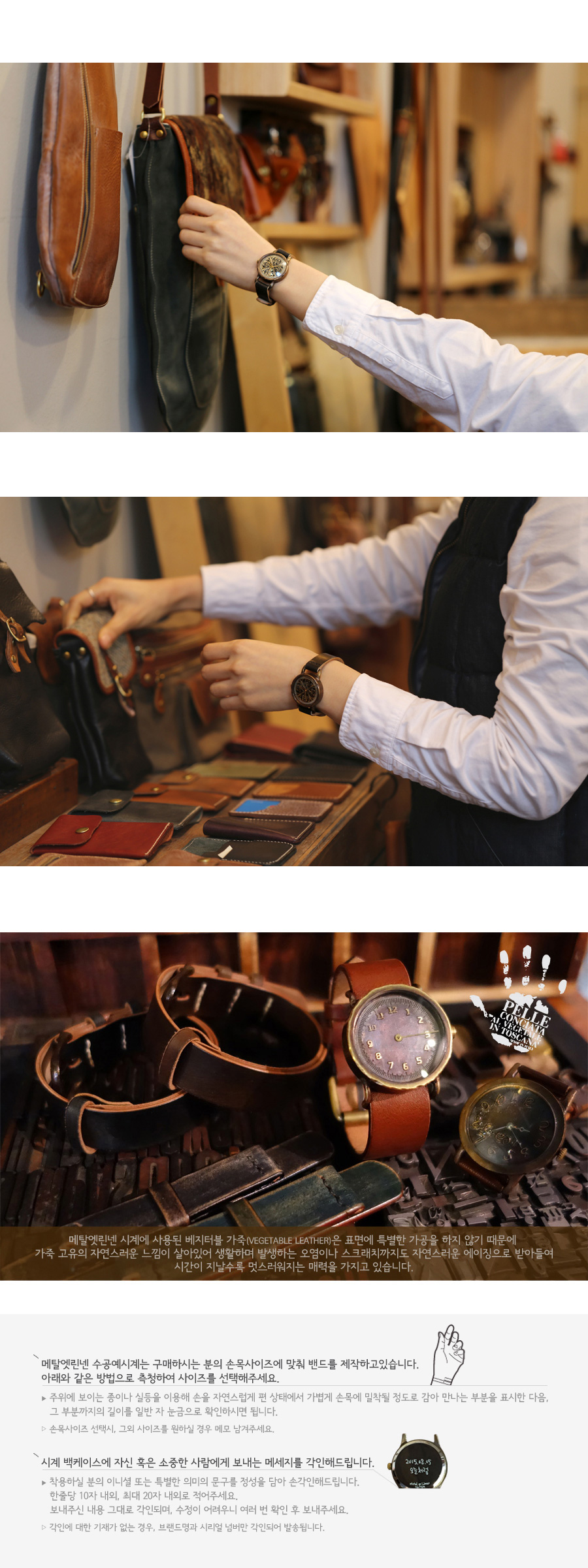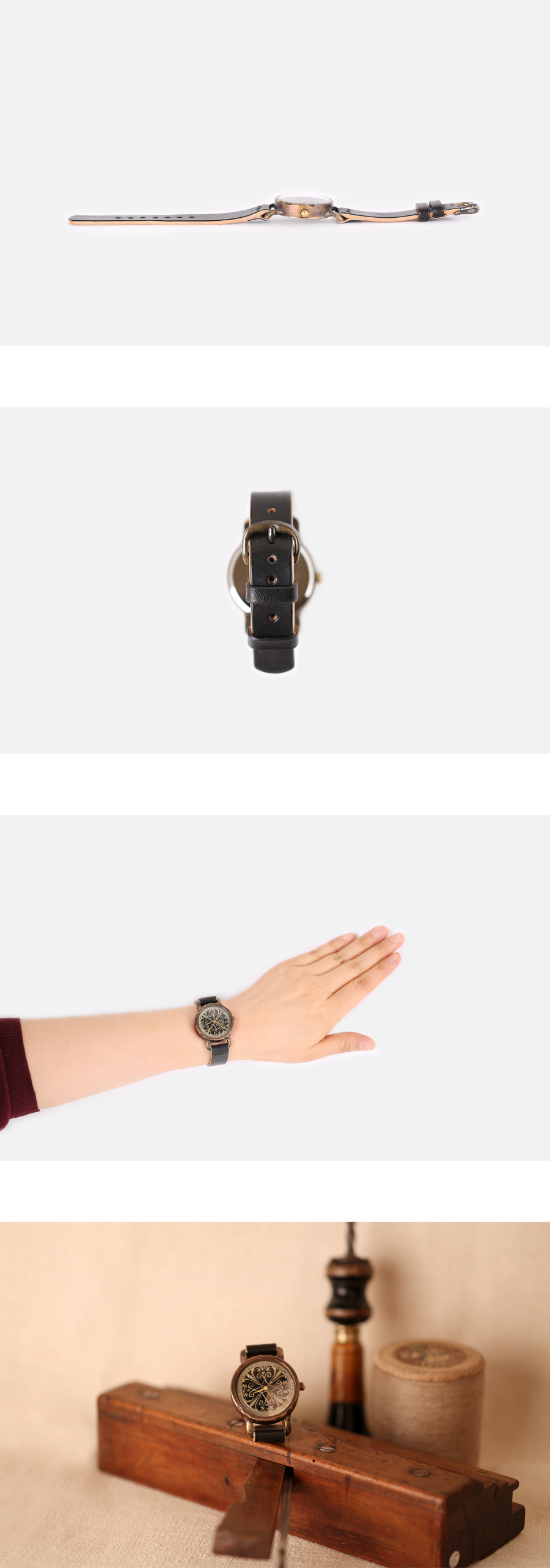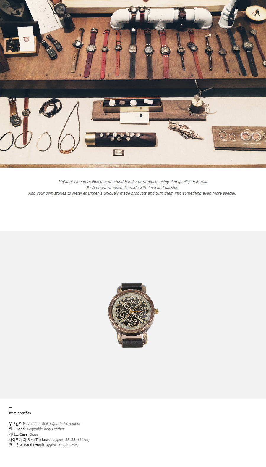 | Handcraft watch ConnieBlack(코니블랙) 메탈엣린넨의 빈티지 황동(brass) 시계 케이스는 착용할수록 점점 밝아지며, 자연스러운 에이징이 되는 가죽 밴드와 함께 시간이 지나면 지날수록 사용자만의 빈티지한 시계가됩니다. 시계에 사용된 황동은 산화되면서 녹청(patina)이 발생할 수 있으나, 금속광택제(metal polishing compounds) 등으로 닦으면 다시 원래의 황동색을 되찾을 수 있으며 황동만의 독특한 소재감을 느끼실 수 있습니다. |
