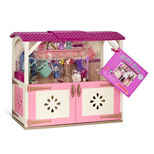 -. Feature : Horse barn that fits two 14" horses. / Perfect size for most 14" dolls. / The perfect addition to the GG collection and a great accessory for the Glitter Girls horses. / This playset includes: (1) 14" horse barn (1) saddle pad and English saddle (1) Plastic bridle (1) basket of apples (1) scraper and grooming glove. / Collect all of the Glitter Girls horses and accessories! / Please note that dolls and horses sold seperately