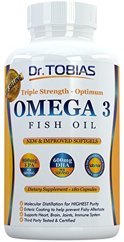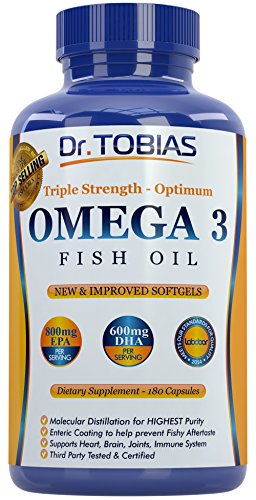 Let The Quality Of Your Fish Oil Reflect Your Wish To Support Your Health. Independently tested for product purity, projected efficacy, ingredient safety, nutritional value, and label accuracy. Dr. Tobias Omega 3 meets the TV Dr's Guidelines of 600mg DHA per day with one serving. What Science Says: Research shows the importance of Omega 3 essential fatty acids for our health.. Supportive but not conclusive studies indicate that Omega-3's may be support: Heart Health, Brain Health. Health of Joints and support Mood and Skin. What You Receive: 90-Days-Supply: 180 capsules (90 servings). Each serving gives you 2000 mg fish oil with 1400mg Omega 3 (800mg EPA, 600mg DHA). Our capsules have enteric coating for better absorption and no fishy aftertaste. We use molecular distillation so you get one of the highest degrees of purity. Look at the product pictures at the top. Buy NOW.
