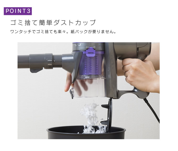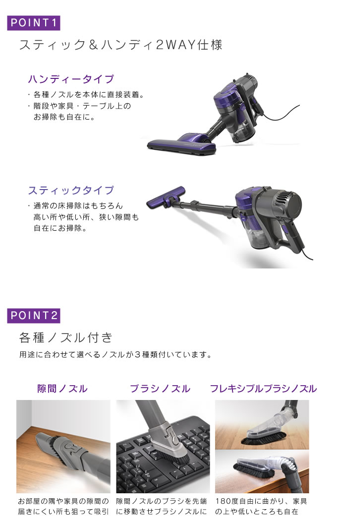 | ポイント | 自由なスタイルで自在に吸引2WAYサイクロンスティッククリーナー |