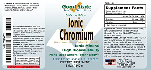 -. Binding : Health and Beauty -. Brand : Good State -. EAN : 0857515003251 -. Feature : 600mcg of ionized Chromium per serving! / Beneficial for healthy blood sugar and bones / 1 serving is 1/2 cap -. Label : Good State -. Manufacturer : Good State -. ProductGroup : Health and Beauty -. ProductTypeName : HEALTH_PERSONAL_CARE -. Publisher : Good State -. Studio : Good State -. Title : Liquid Ionic Chromium 8 Ounce - 600 mcg per serving - 96 Total Servings -. UPC : 857515003251