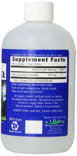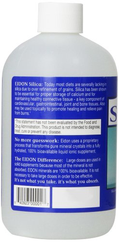 -. Binding : Health and Beauty -. Brand : Eidon -. EAN : 0640923000017 -. Feature : Helps form the collagen matrix and manage calcium / 36 servings / Mineral dietary supplement / Easy to swallow / Gentle on the stomach -. IsAdultProduct : 0 -. Label : Eidon -. LegalDisclaimer : Unless otherwise noted, this item has not been evaluated by the United States Food and Drug Administration. It is not approved to diagnose, treat, cure or prevent disease. -. Manufacturer : Eidon -. MPN : EI0013 -. NumberOfItems : 1 -. PackageQuantity : 1 -. PartNumber : EI0013 -. ProductGroup : Health and Beauty -. ProductTypeName : HEALTH_PERSONAL_CARE -. PublicationDate : 2013-10-12 -. Publisher : Eidon -. ReleaseDate : 2013-10-09 -. Studio : Eidon -. Title : Eidon Silica Supplement, 18 Ounce -. UPC : 640923000017