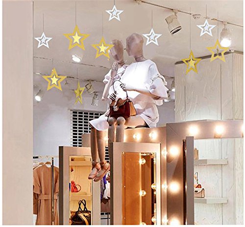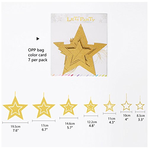 SIZE:7 silver and 7 gold stars,each colr have 7 dierent size(19.5cm,17cm,14.6cm,12.2cm,11cm,10cm,8.5cm) Order multiple sets for a more dramatic effect.