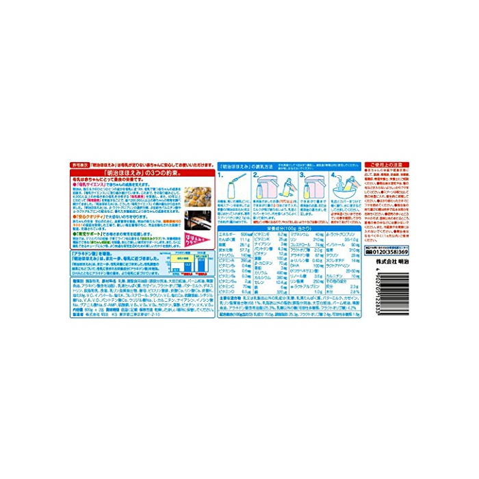 원재료:유당,조정 식용유지(돈지분별유,대두 백교유,팜핵유,정제어유,a la《기돈》산 함유 유지)고, 유청단백질,(Kasein)카세인,Fructooligo당,버터 밀크,덱스트린,탈지분유,식염,유(phospholipid)인지질 추출물,효모,《피로린》산철,탄산Ca,인산Ca,탄산K,염화Mg,V.C,이노시톨,염화K,콜레스테롤,타우린,V.E,염화Ca,유산 아연,시틸딜산Na,V.A,V.D,판토텐산Ca,유리딜산Na,L-카르니틴,나이아신,inosinic산Na,《구아니루》산Na,5''-AMP,유산동,V.B1,V.B2,V.B6,카로텐,엽산,V.K,V.B12