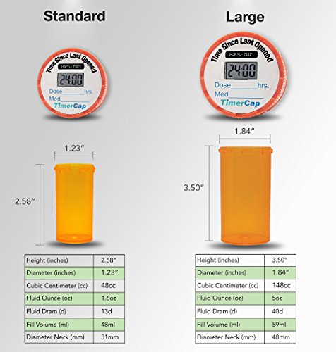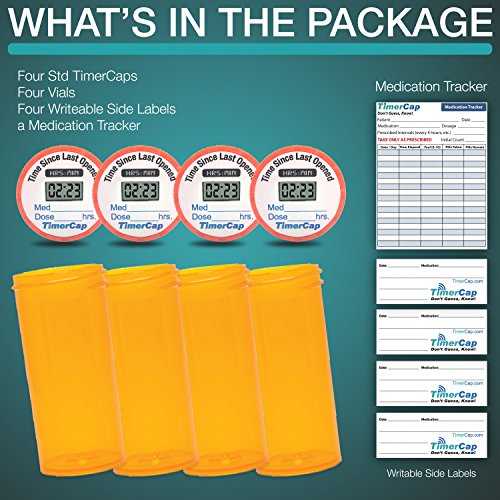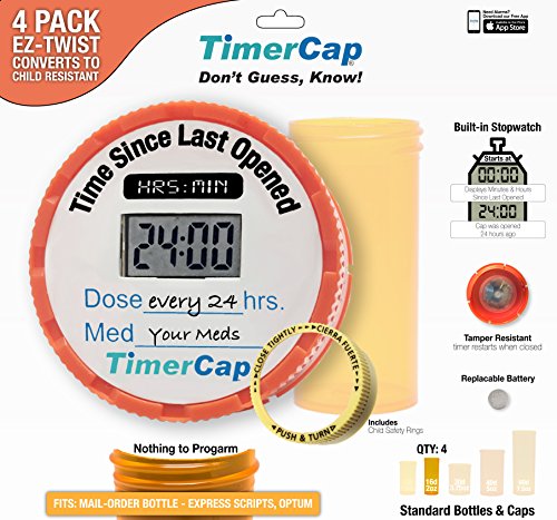 Studio : TimerCap LLC Publisher : TimerCap LLC Binding : Health and Beauty Product Description Timer Caps have a built-in stopwatch with an automatic sensor resets to zero and starts counting up the seconds, minutes, and hours since last opened. This lets you know precisely to the minute the last time you took your medication without the worry of pressing any buttons or setting any alarms. It's the perfect pill organizer that lets you manage your medication in the bottle to keep your label and safety information at your fingertips. Timer Cap are the perfect way to seamlessly coordinate care of children, teens, elders, or pets as you will always be reminded by the LCD when the last time was, even if someone forgets to mention it or write it down. Since the Timer resets every time, it's also the perfect tool to see if someone was in your medication and a deterrent for other stay out or risk being caught. There are no alarms or alerts, if you do need alarms, check out the Free TimerCap App. All products come with a tracker form to record you success. TimerCaps come in different sizes and styles to match to your pharmacy style. We also include bottles, just in case. If the TimerCap did not fit or you're not sure, ask your pharmacy for a label for the new bottle or match the vial style base on the above picture. Use these instead of daily, weekly, AM/PM , 7-day, organizers as TimerCap keep you safe by knowing if you took your meds, not guessing. TimerCaps and vials are easily transported in your pocket or purse (not EZ-Twist), protecting your pills from moisture and won't open up on their own. Timer Caps will help ensure you're medication is taken on time, every time. Batteries that are not replaceable (there are videos that do show it being done, however as the manufacture we can't recommend it and batteries last 12-18 months. Mail-Order Style (most popular) is the only one that has replaceable batteries (LR41) 0