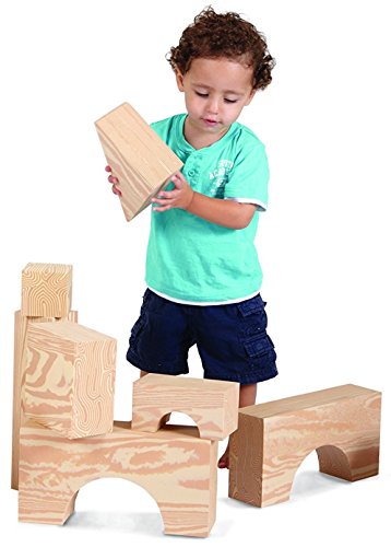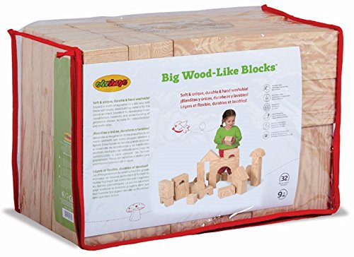 Giant, oversized (almost 3" thick) soft foam blocks that look like real wood. Firm wood-like Edu-Foam building blocks are as much fun as their classic real wood counterparts, but safe enough for a 9 month old. No splinters, no heavy, sharp wooden corners to injure. Jumbo sized blocks make it easy for small hands or special needs hands to grip. 32 pieces range from 3" X 3" up to an amazing 12" X 6" of building fun.Feature