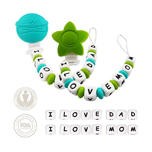 -. Feature : I Love Mom & I Love Dad teethers - Big, soft and chewy beads are made from food grade silicone. The bright colors and shapes are designed to stimulate baby's motor, visual and sensory skills. Easy to be grabbed and handled by little hands, and it enhances baby's hand-to-mouth coordination. With lots of room to chew, it is effective at massaging baby's painful teething gums-put in the refrigerator for added relief. / Lil Teethers are practical teether pacifier clips that also offers the ability to attach easily to teething rings and toys, car seat straps, high chair straps, baby blankets, drool bibs, pacifiers, etc. The clips open and close easily-no sharp clamps that can pinch baby's fingers, and it comes off with a firm tug to prevent damage to baby's clothes. Clean easily with water and soap, or put in the top rack of the dishwasher. / Lil Teethers are hand-made, and offers excellent gum stimulation and the development of heathy teeth. It has been passed by the FDA, CPSC, California Prop 65, as well as Canadian, Australian and European authorities as a safe, food grade silicone teether/ pacifier clip for baby. It is non-toxic, BPA Free, no phthalates, cadmium, lead or metals. / Versatile and functional, this is a great gift for teething babies. / Soft, flexible, and non-porous-it is an essential for teething babies. Proudly sold with a Manufacturers - No Questions Asked - Money Back Guarantee. Read the description below for more details.