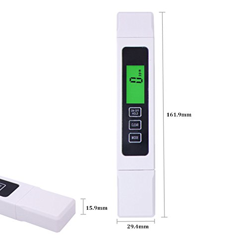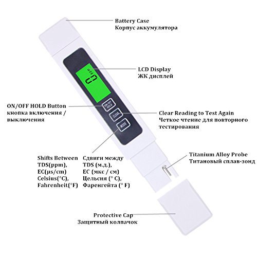-. Feature : Digital display: accurate to 4 digits. Temperature compensation accurate to 0.1 / Backlight function: green backlight while TDS value <40,red backlight while TDS value>=40. / Auto-lock: TDS value stabillizes 4 seconds, instrument automatically lock readings. / One Touch function: Forget to turn off the power, automatically shut down after 2 minutes. / EC testing range: 0-9999μs / TDS testing range: 0-4999ppm / Accuracy: ±2% F.S / Temp:0-99°C&32-212°F, accuracy±0.1°C