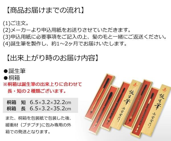 誕生筆は赤ちゃんがお母さんのお腹の中にいる時にはえた初毛(うぶげ)でつくる、一生に一度しかできない貴重な筆です。赤ちゃんのすこやかな成長と幸福を祈って誕生筆をお作りください。