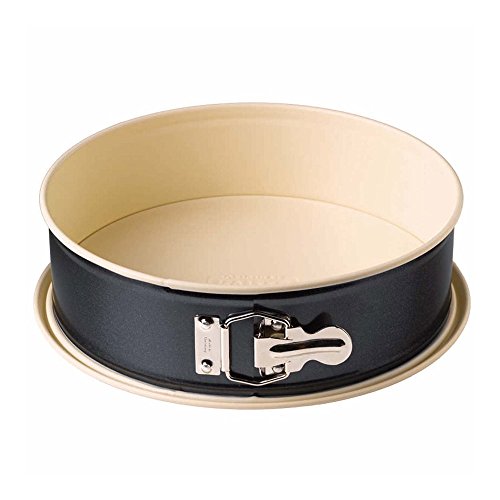 Product Description In a spring form pan, the sides of the ring are loosened by means of a clasp: the ring opens and you can remove the base of the pan or fit it in again. Use the flat base of the spring form pan to prepare cakes and flan cases. The base with a funnel hole at the center can be used instead of a wreath cake pan for sponge cakes and Gugelhupf. In contrast to other baking pans the cake is not turned upside down when it is done. Simply loosen the clasp and lift the ring up off the base - thanks to the nonstick coating the cake comes out on its own. Since the carrier base is somewhat larger than the ring spring form pans are entirely leak-proof. 0