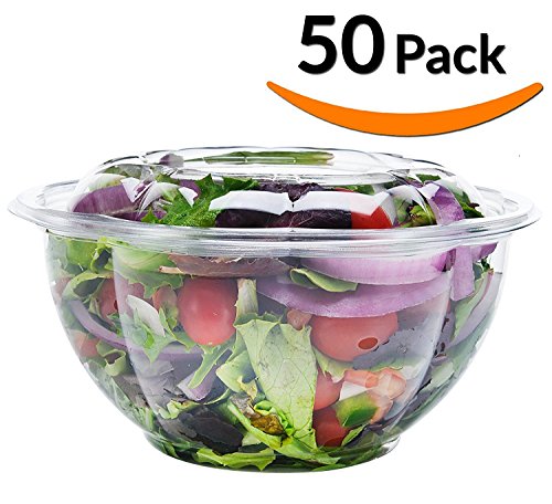 50-Pack 32oz Plastic Disposable Salad Bowls with Lids - Eco-Friendly Clear Food Containers - Extra-Thick Materials - Portable Serving Bowl Set to Pack Lunch - Super Strong Seal To Preserve Freshness