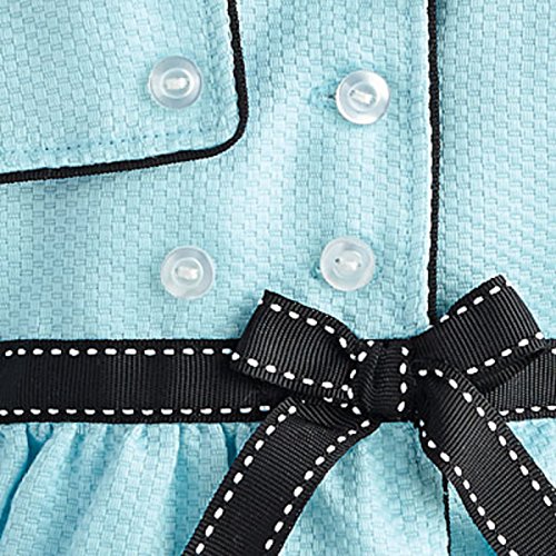 When the seasons start to turn, on-the-go Grace is ready with this stylish blue button-up trench coat. It has black ribbon accents and a bow at the waist.