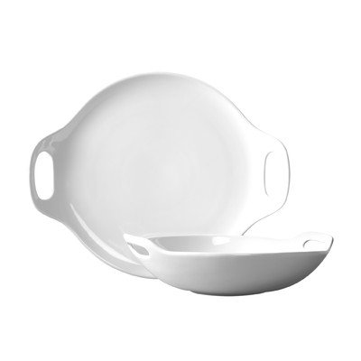 TTU-T4009-EC Features: -Blanc de Blanc collection. -Material: Stoneware. -Chip resistant. Product Type: -Platter. Color: -White. Material: -Stoneware. Number of Items Included: -2. Pieces Included: -Platter; Serve Bowl. Pattern: -Solid color. Dimensions: -Platter: 1.75" H x14.25" W x11.5" D. -Bowl: 3" H x 11.38" W x 9.5" D. Overall Height - Top to Bottom: -2". Overall Width - Side to Side: -14.125". Overall Depth - Front to Back: -11.5". Overall Product Weight: -6.5 lbs.