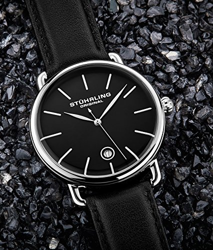 Brand, Seller, or Collection Name:Stuhrling Original Model number:768.02 Part Number:768.02 Model Year:2011 Item Shape:Round Dial window material type:Krysterna crystal Display Type:Analog Clasp:Buckle Case material:Stainless steel Case diameter:42 millimeters Case Thickness:10 millimeters Band Material:leather calfskin Band length:Men's Standard Band width:20 millimeters Band Color:Black Dial color:Black Bezel material:Stainless steel Bezel function:Stationary Calendar:Date Special features:Second hand Movement:Swiss quartz Water resistant depth:165 Feet