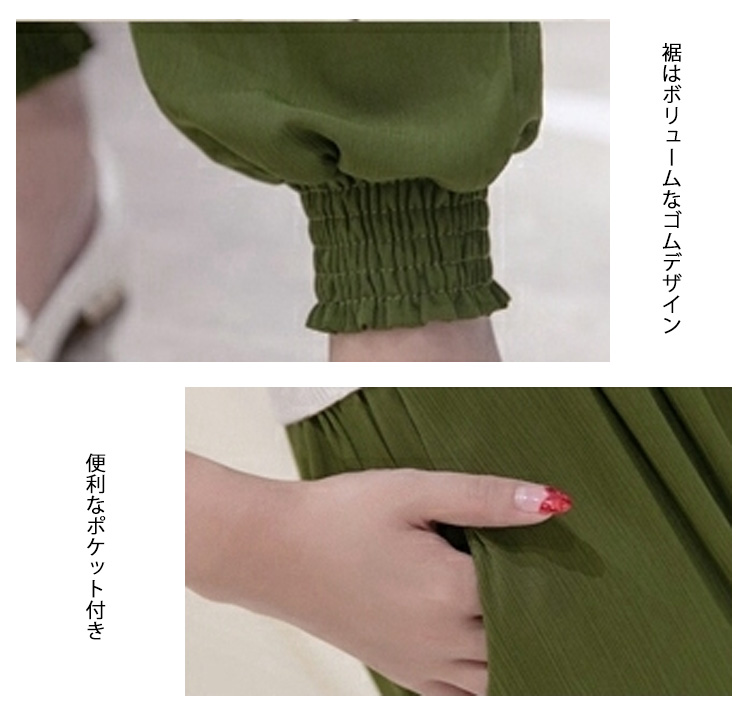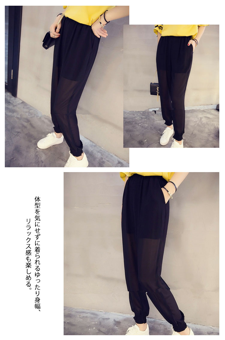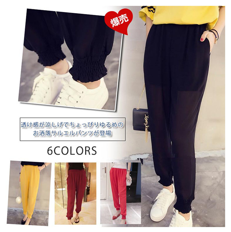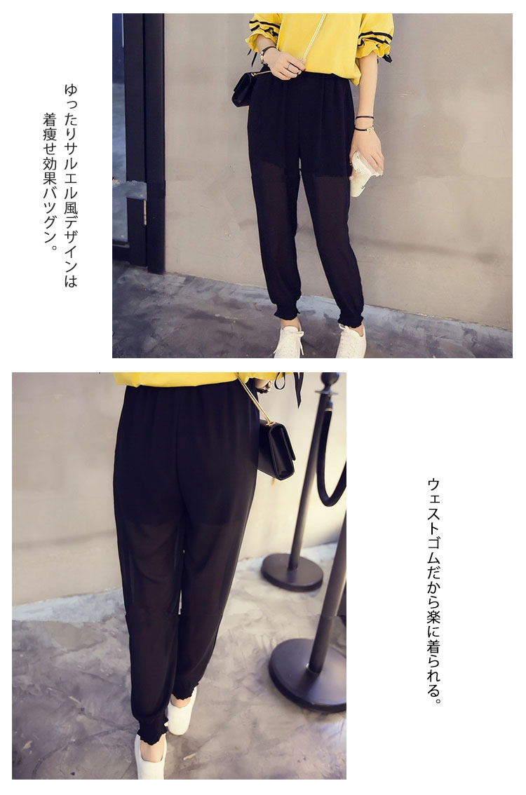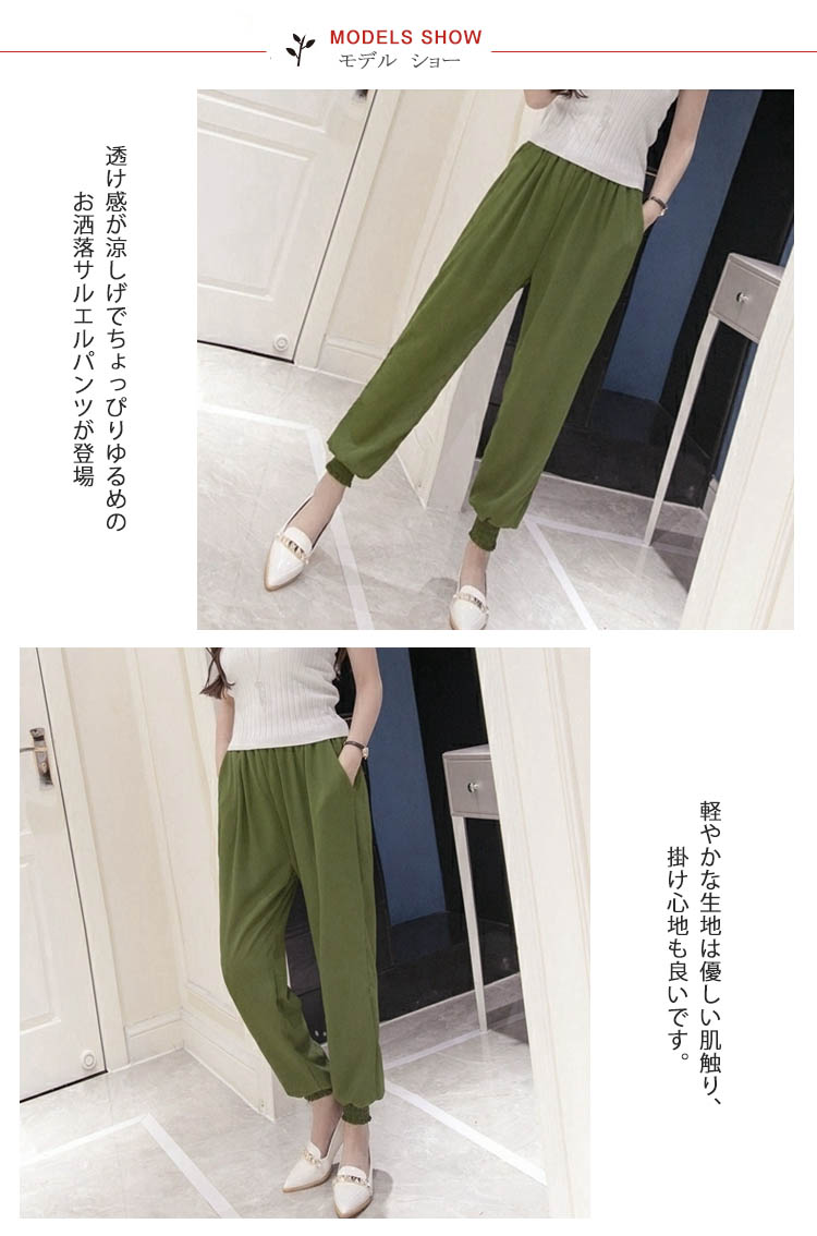 | 透け感が涼しげでちょっぴりゆるめのお洒落サルエルパンツが登場軽やかな生地は優しい肌触り、掛け心地も良いです。ゆったりサルエル風デザインは着痩せ効果バツグン。ウェストゴムだから楽に着られる。体型を気にせずに着られるゆったり身幅、リラックス感も楽しめる。 優しい表情のベーシックカラー、季節っぽさたっぷりの1枚。 | |