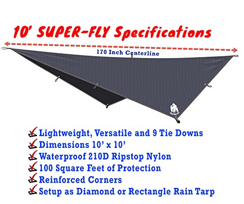 ✔ SUPER-FLY IS OUR MOST VERSATILE RAIN FLY. 2 REINFORCED CENTERLINES, 9 TIE DOWNS. INCLUDES STAKES, ROPES AND TENSIONERS! Truly waterproof in a torrential downpour! 170" long diagonal centerline keeps you dry (Bear Butt centerline only 142")! Easily covers doublenest hammock. Square design = more coverage and setup options than diamond. And can be angled out to provide a large covered area for cooking or relaxing or staked near the ground on both sides of the hammock GET YOURS TODAY!