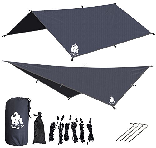 ✔ LIGHTWEIGHT, PORTABALE, VERSATILE, INDESTRUCTIBLY BUILT & BACKPACKER APPROVED. With 9 tie down loops AND grommets for multiple anchoring points our hammock tarp is ideal for hiking, camping, backpacking, cycling, boating, sporting events, festivals and travelling. Sets up in minutes. Comes with a rain proof gear sack, making it convenient to take on trips or store when not in use. Chill Gorilla gear is practical, reliable, lightweight and durable. DON'T WAIT, GET YOURS TODAY!