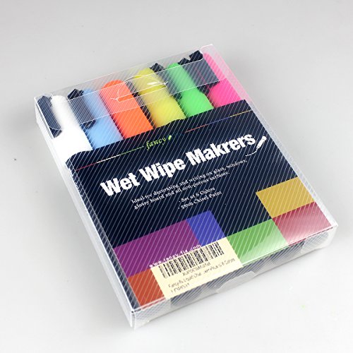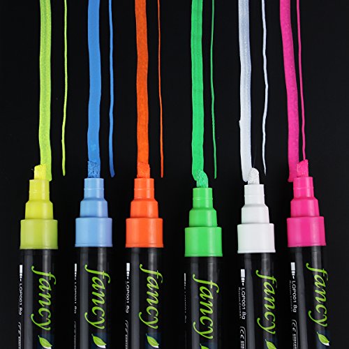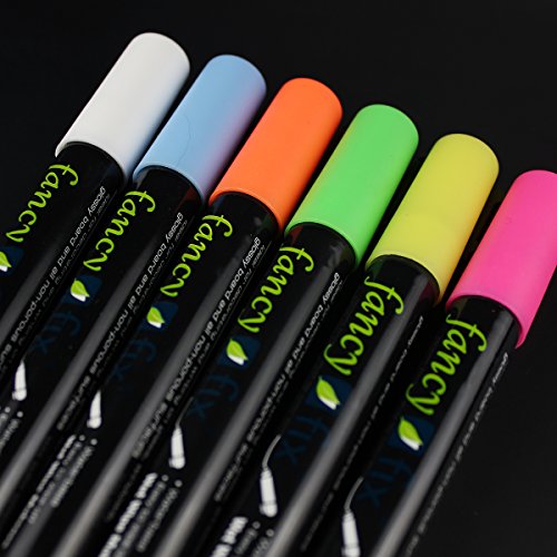 Feature : fancy-fix liquid chalk marker (5mm Chisel Tip)-6 colors Pack: White/ Pink/ Blue/ Green/ Yellow/ Orange. / Dust-free, water based chalk pen, and erases cleanly from non-porous surfaces / Erase easily with a moist cloth - no chemicals needed, just use water / Completely non-toxic, environmentally friendly, and perfect for ages 3 / The 6 colors Pens stand out very nicely bright and vibrant, eye catching and easy to read