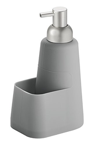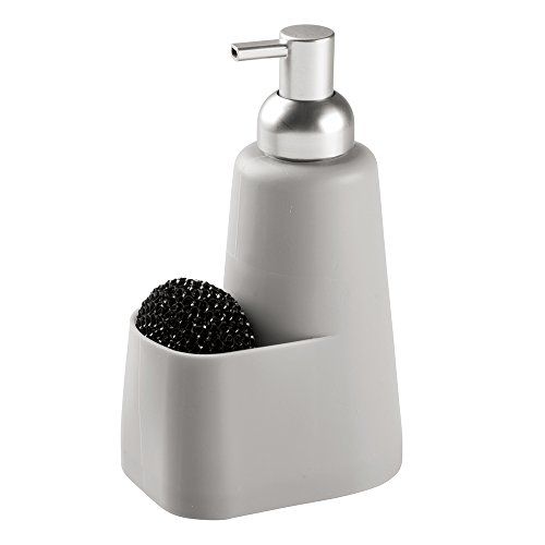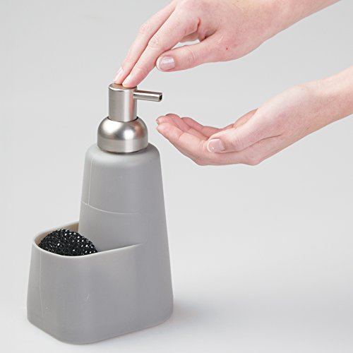 mDesign Silicone Soap Dispenser Pump and Sponge Caddy Organizer for Kitchen Countertops - Gray/Brushed