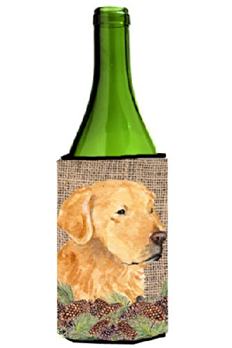 Golden Retriever on Faux Burlap with Pine Cones Wine Bottle Beverage Insulator Beverage Insulator Hugger