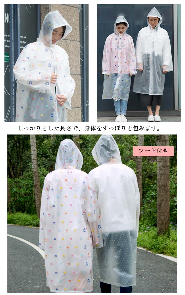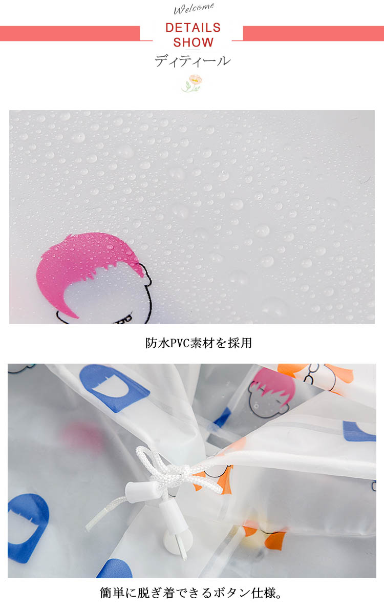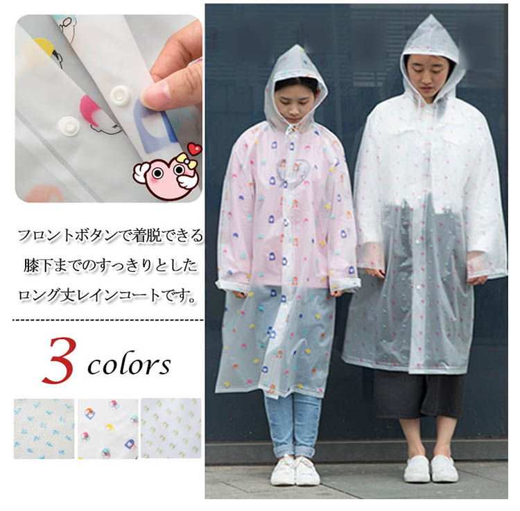 | フロントボタンで着脱できる膝下までのすっきりとしたロング丈レインコートです。膝下までストンとした長め丈の綺麗なラインが特徴。コートタイプなので羽織るだけで着用でき便利です。 | |