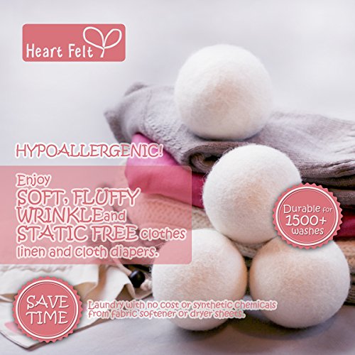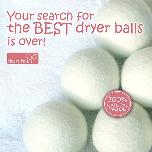 Heart Felt Wool Dryer Balls (6 Pack XL) Pure New Zealand Wool, No Cheap Fillers, Natural Reusable Non-Toxic Fabric Softener, Reduces Drying Time