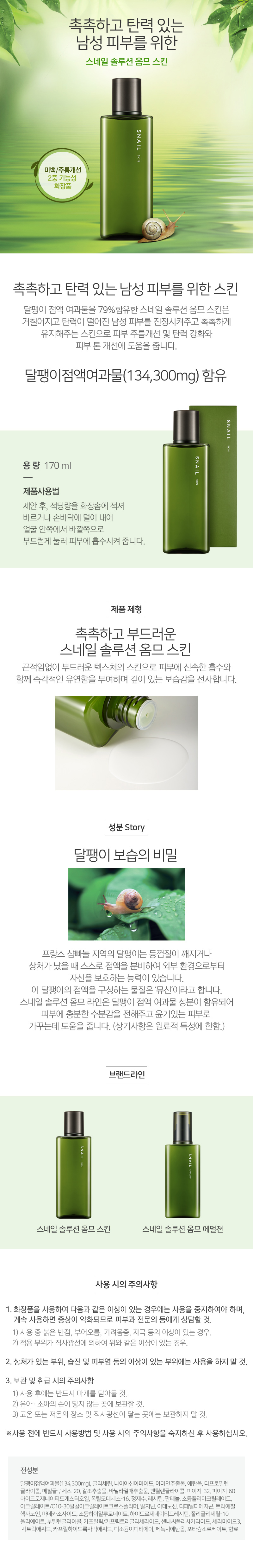 しっとり弾力弾む男性肌のための化粧水!カタツムリ粘液浄化物を79%含んだスネイルソリューション!荒れた男性肌を落ち着かせ、なめらか&明るい肌に仕上げます。 【商品構成】カタツムリソリューションオムスキン170ml