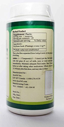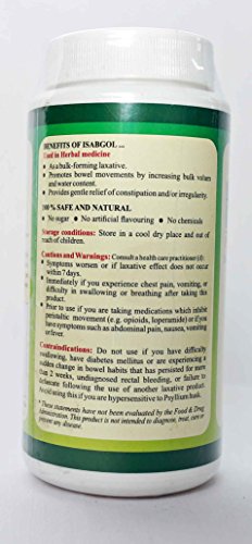 Psyllium husk (also called Isabgol or Isphagulla in India) is the high level of soluble fiber containing seed husks of Plantago ovata, a plant commonly found in India. In addition to gentle relief of irregularity/constipation, it is also known to be used for softening stools in case of hemorrhoids/ anal fissures. Psyllium husk promotes bowel movements by increasing bulk volume and water content. The product does not contain Sugar, Corn, Dairy Products, Salt, Soy, Yeast or GMO.Feature