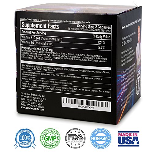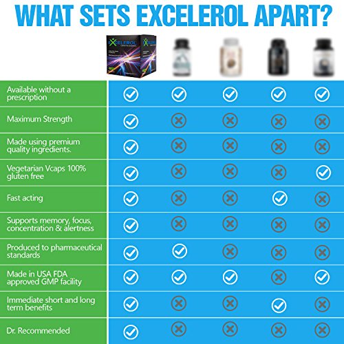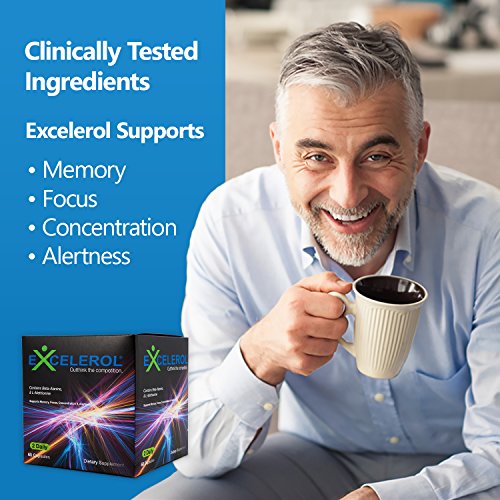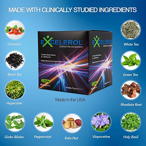 Studio : Accelerated Intelligence Inc. Publisher : Accelerated Intelligence Inc. Binding : Health and Beauty Product Description EXCELEROL GEN 2 - Maximum Strength Doctor Recommended Brain Supplement. Supports Memory, Concentration, and Focus. Excelerol Gen 2 is a new cutting edge nutraceutical dietary supplement designed to get you the brain performance support you need. Excelerol supports memory, focus, concentration and alertness. Several of the ingredients in Excelerol may be important chemical nutrients for the brain. Supports Memory, Focus, Concentration,Alertness. Maximum Strength -Available Without A Prescription. Vegetarian Capsules -