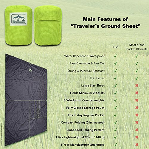 UNIQUE “GEM OF A PRODUCT” - Compared to similar pocket-blankets, the Traveler’s Ground Sheet is the Only One that has 8 counterweights agains wind-blowing, the Only One that holds the sheet tight preserving the compact shape of the pouch thanks to the unique folding-pattern embedded in the sheet and the Only One that really fits 4 persons sitting or 2 comfortable laying down