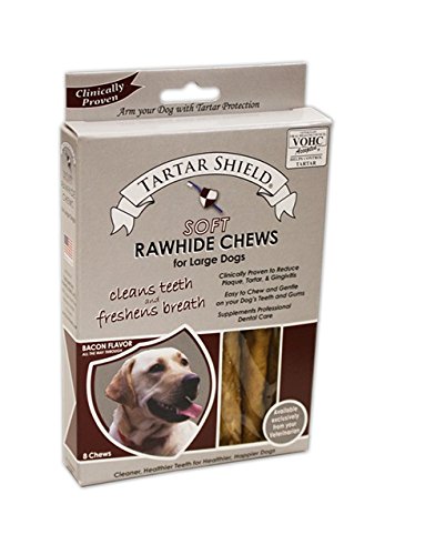 -. Feature : Prevents tartar, plaque, freshens breath, cleans teeth and helps to reduce bacteria / Many dogs have trouble chewing conventional rawhide, which can present choking hazards. Our Chews are specially made to "give" when your dog bites into them, making rawhide suitable for every dog! / In most dog chews, the flavoring is only coated on the surface, in Tartar Shield Soft Rawhide Chews, the savory bacon flavor is baked all the way through, making each bite as delicious as the first / Tartar Shield Soft Rawhide Chews are coated with a unique mixture containing sodium tripolyphosphate to prevent tartar formation and an antimicrobial agent to prevent plaque formation and malodor / Veterinary recommended