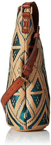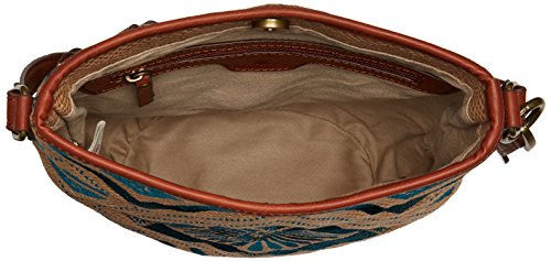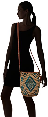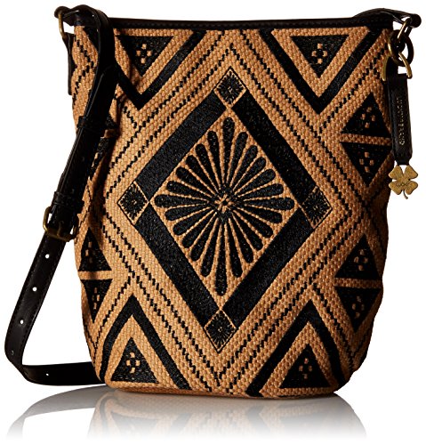 Linen bucket crossbody with embroidered embellishments and adjustable faux leather crossbody strap