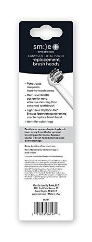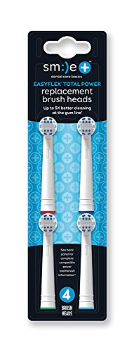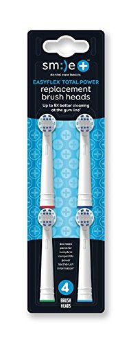ReleaseDate : 2015-09-14 Studio : Ranir Publisher : Ranir Binding : Health and Beauty Product Description Smile Easy Flex Total Power replacement brush heads are comfortable to use and leave the mouth feeling clean and fresh. Provides up to 5X better cleaning at the gum line than a manual toothbrush! Penetrates deep into hard-to-reach areas. Multi-level bristle design for more effective cleaning than a manual toothbrush. Light-blue Replace-Me bristles fade with use to remind user to replace brush head. Dentists recommend replacing brush head every 3 months for optimal brushing performance. Compatible with most Oral-B power toothbrushes. Does not fit Vitality Sonic, Oral-B Sonic Complete, Pulmonic, Cross Action Power battery toothbrush, Oral-B Complete battery toothbrush, and 3D White battery toothbrush. Package includes four replacement heads with identifier color rings. Not intended for children age 3 and under versus. a regular manual toothbrush based on in vitro laboratory testing. 0