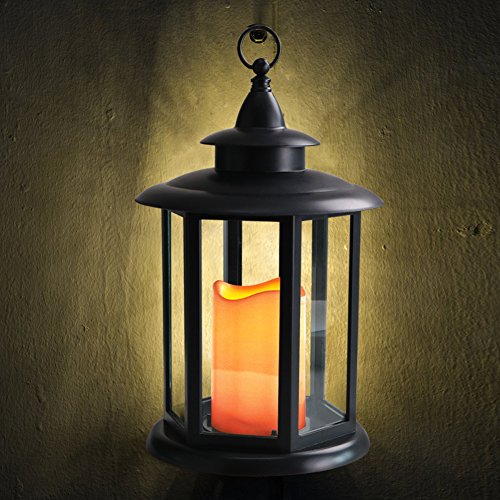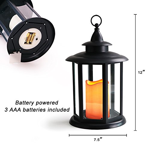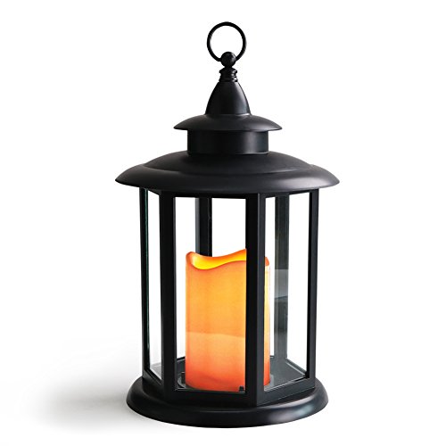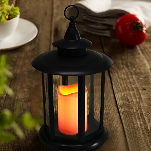 - 12" TALL HEXAGON CANDLE LANTERN WITH FLICKERING LED PILLAR CANDLE - A graceful marriage of beauty & practicality adds a gorgeous touch anywhere - 12" tall black HEXAGON candle lantern with an antique finial creates a look of a cherished heirloom - A big LED pillar candle has the look of a real wax candle with WAVY EDGE and SOFT AMBER GLOW FLICKER, captivating and safe - Eye-catching prop for tables, bars, patios, porches; IP44 rated fabulous INDOOR & OUTDOOR decor looks fantastic DAY & NIGHT.