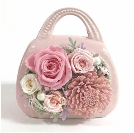 fk094igrjsラブリーなバッグタイプの陶器に、ローズをメインにアレンジしました。一際大きなローズと、アートのラメ付きダリアがインパクトと豪華さを演出してくれます。ディスプレイ用のクリアケース入りで、ギフトにもおすすめです。