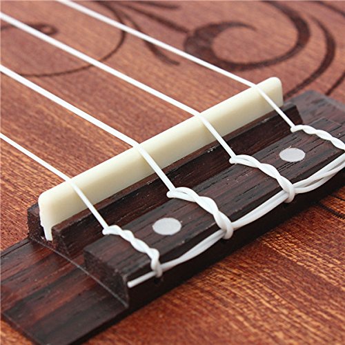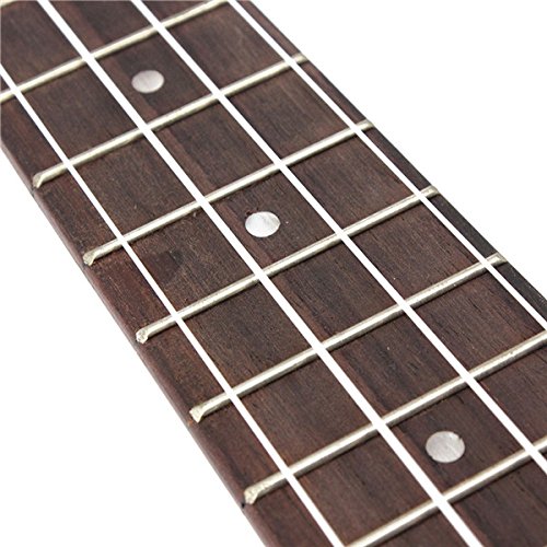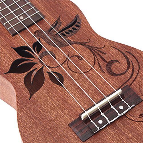 21" mini size, perfect size for adults and kids. Body is made of sapele, fingerboard is made of rosewood. With delicate tuning peg, easy to tune. Nylon string to make nice sound. Has special sound hole, exquisite workmanship. The pattern on ukelele is very exquisite and beautiful.