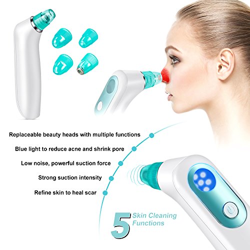 -. Feature : TOTALLY NEW BLACKHEAD REMOVAL TOOL: The machine remove the cuticle and dead skin tissue, the black and grease sucked away, skin care and essence of the liquid is more effectively absorbed by the skin, while stimulating collagen regeneration, the skin can be in the first course of treatment becomes more shiny and delicate. / WITH BLUE LIGHT CARE MODE: An advanced acne treatment which can emit blue light with wave length 415nm.This mode can effectively kill bacterial inside pores and pimples.Strongly suck out the black and then use the power of blue light irradiation for 5 minutes, inhibit the growth of acne acne, to prevent large pores! / ZERO-PORE SKIN: four replaceable heads, you can choose the most suitable beauty head they need according to what beauty effects desired most. Coarse, fine, precise suction heads for different functional skin cleansing. / PROFESSIONAL SKIN PURIFYING: 3 working Intensity level settings can be adjusted according to your beauty requirement. You can select the suitable one to do skin care with this gadget. / NO HARM TO SKIN: Suitable for all skin types, can be used on forehead, neck, cheeks and nose. Easy to portable and easy to clean.