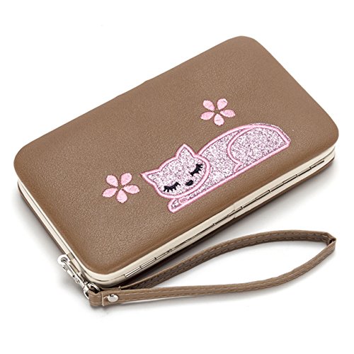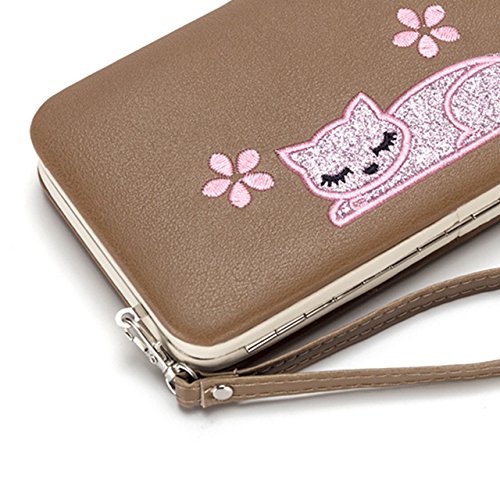 -. Feature : Premium Material --- Made of High Quality Premium PU Leather (Shell Fabric) and Polyester (Lining), Lightweight, Wear-resisting and Durable to Use / Multi Functions --- 1 x Cash Room, 1 x Zipper Coin Pocket, 1 x Space for Phone, 7 x Card Holders (Including 1 x ID Display Window). It is a wallet that can meet your everyday needs, convenient to hold your cellphone, bills, coins, cards, passport and driving license. / Size --- Length - 17.7 CM, Height - 10.2 CM, Thickness - 2.8 CM (6.96*4.01*1.10 INCH); It can hold most smartphones, such as iPhone X/8/8 Plus/7/7 Plus/6s/6s Plus/6/6 Plus/5/5s/5c/4, Samsung Galaxy S8/S8 Plus/S7/S7 Edge/S6/S6 Edge/S5/S4/S3/S5 Active/On5, HTC One M9 /EYE /M8, Sony Xperia Z3/Z2 /Z1, LG G3/G5/G6, ZTE Grand X4/Axon 7/Axon 7 Mini/Axon Pro/ZMAX 2, Moto G4/G4 Plus/G5/G5 Plus/G3/E4 Plus/Z Play/Z Force, Huawei Mate 10/Mate 9/P9/P8 Lite/Honor 8/Honor 6X/Honor 5X/Honor 5c. / Unique Design --- 1.SNAP CLOSURE for Better Security; 2.MINI LAGE Design with Embroidered FLOWER and CAT, Making you Outstanding in Crowd, Ideal Gift for Yourself, your Family and Friends; 3.LONG WALLET Style with Bifold Design, Large Capacity to Hold your Necessities, Easy Access to Cash, Credit Cards or Cellphone When Needed / Package --- It contains a stylish wallet (with a WRIST STRAP) and a exquisite GIFT BAG, which is of good quality. Please kindly don't throw the bag away when receiving the package, since you can still use it to hold your jewelry or other important small things.
