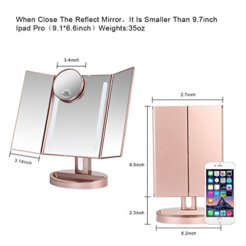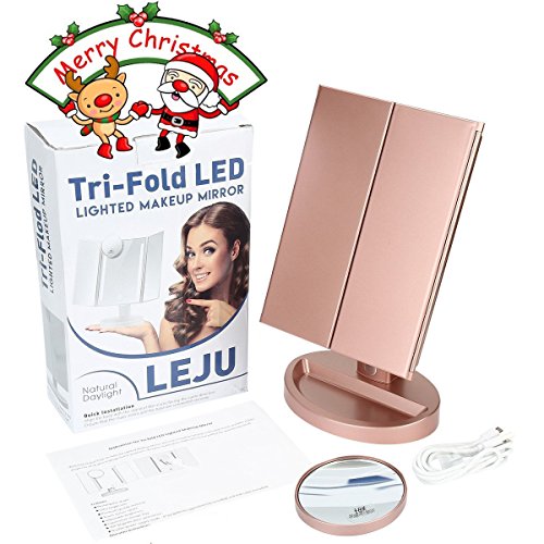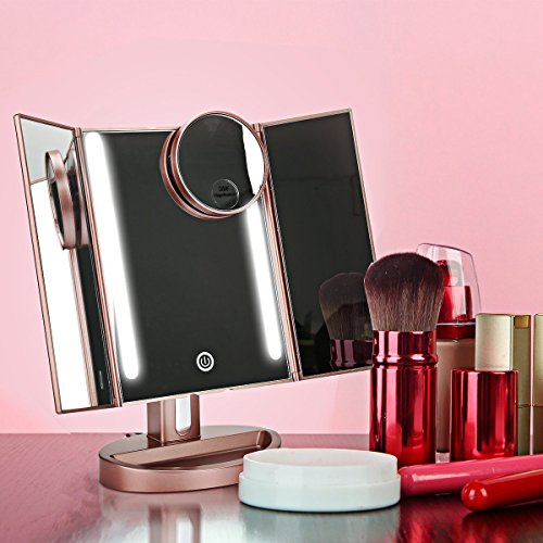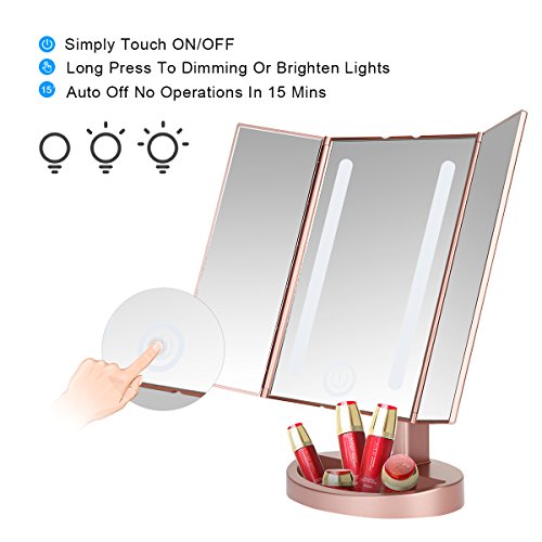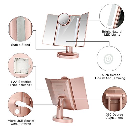 LEJU Makeup Mirror / Natural Daylight Lighted Vanity Mirror with Touch Screen Dimming, Detachable 10X Magnification Spot Mirror, Two Power Supply Mode (Rose Gold)
