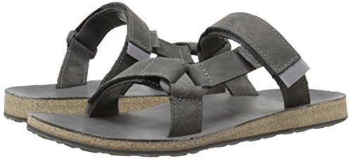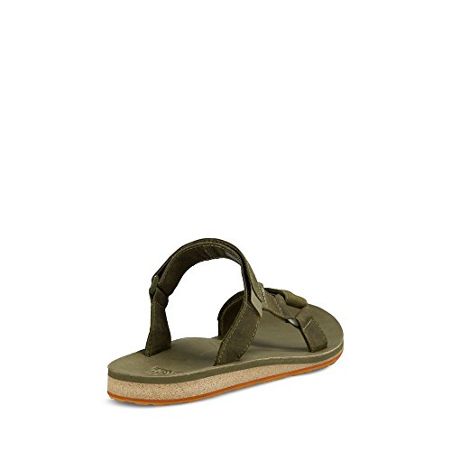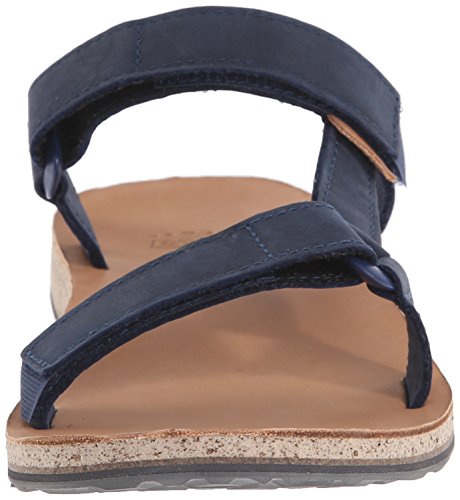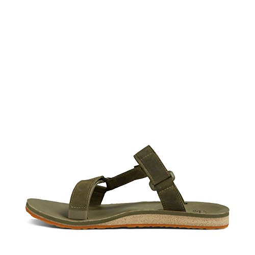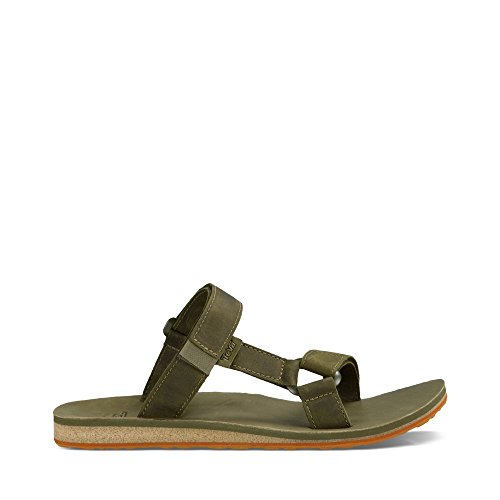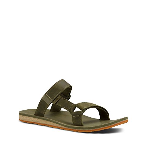 Slide sandal featuring leather hook-and-loop straps at vamp and toe