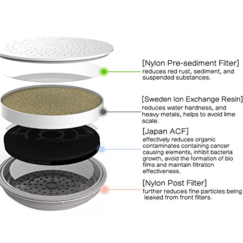 Filtration: Step 1: [Nylon Pre-sediment Filter] reduces red rust, sediment, and suspended substances. Step 2: [Sweden Ion Exchange Resin] reduces water hardness, and heavy metals like mercury, lead in water. It helps to avoid lime scale. Step 3: [Japan Activated Carbon Fiber (ACF)] effectively reduces chlorine, benzene, phenol, and those organic contaminates containing cancer causing elements. With the patented antibacterial technology, the ACF filter is able to inhibit bacteria growth, ensure healthy drinking water, avoid the formation of bio films and maintain filtration effectiveness. Step 4: [Nylon Post Filter] further reduces fine particles being leaked from front filters. Applicable water source: municipal tap water