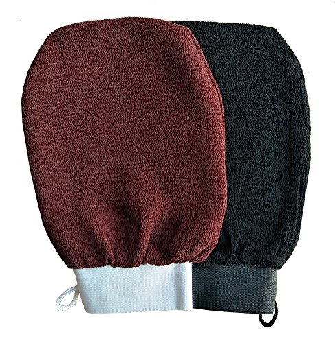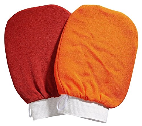 Featuring two different types of exfoliating gloves in each pack, two of each type, these nicely constructed, large shower exfoliating mitts are incredibly effective, durable and the elastic wrist band keeps it from sliding off your hand. There's also a small loop so you can hang them up to dry and come in 4 colors red, orange, black and brown.