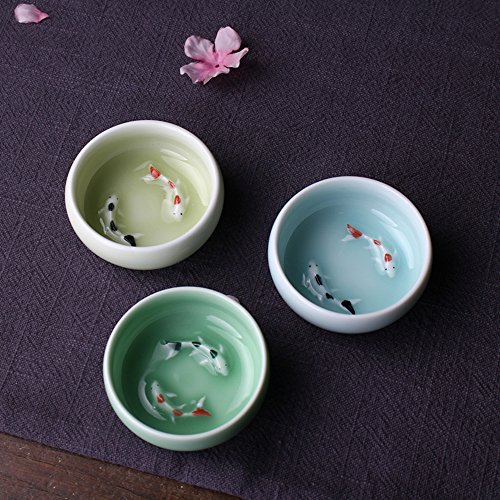 -. Title : Handmade Celadon Chinese Kung Fu Small Volume Teacups 2oz. Vivied Fish (3 Colors, set of 3)