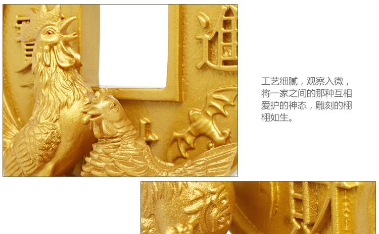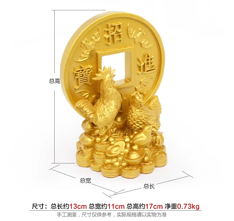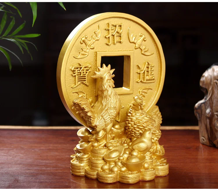 此款树脂鸡摆件取材于民间元素,雄鸡昂道挺胸,护卫在母鸡与雏鸡的身旁,俨然一幅全家合乐的景象。鸡一家亲密地靠在一起,踩在钱财堆砌而成的金钱山上,背靠招财进宝大铜钱,寓意着家庭合睦,福气临门,财运跟着旺盛!
