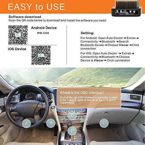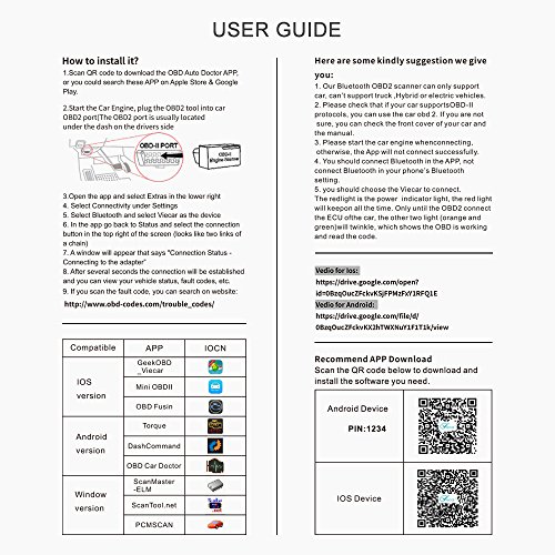 • BLUETOOTH 4.0 CONNECTION - Upgraded Bluetooth 4.0 OBD2 scanner supports Android and IOS(The old Bluetooth 2.0 OBD2 scanner only supports Android). Compatible Apps include Torque Lite, DashCommand, GeekOBD-Viecar, etc. Bluetooth 4.0 connection distance is 33ft, you can connect the Bluetooth OBD2 and Bluetooth earphone at the same time.
