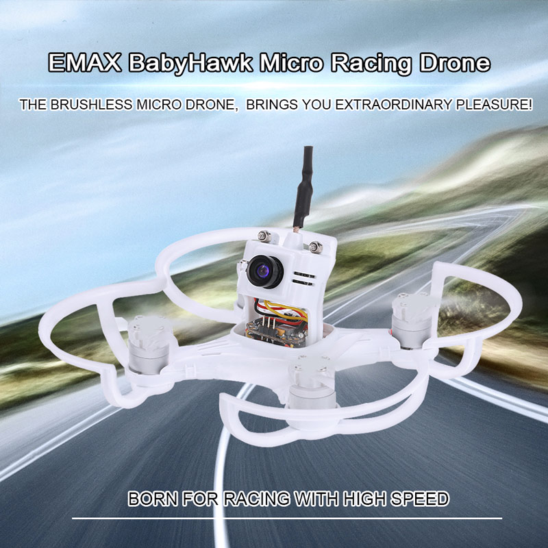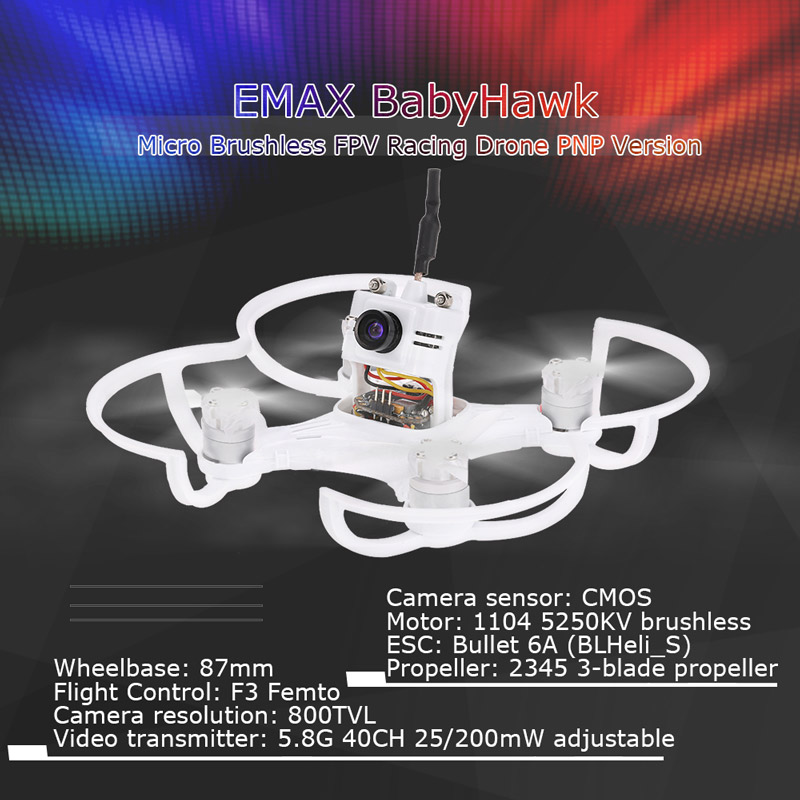 This EMAX BabyHawk is equipped with F3 Femto flight controller, 1104 5250KV brushless motor and BLHeli-S 6A ESC, ideal for racing drone. The wheelbase is only 87mm, also suitable for indoor flying. The built-in 5.8G 40CH FPV transmitter supports most 5.8G goggles/monitors. It's a great choice for you.