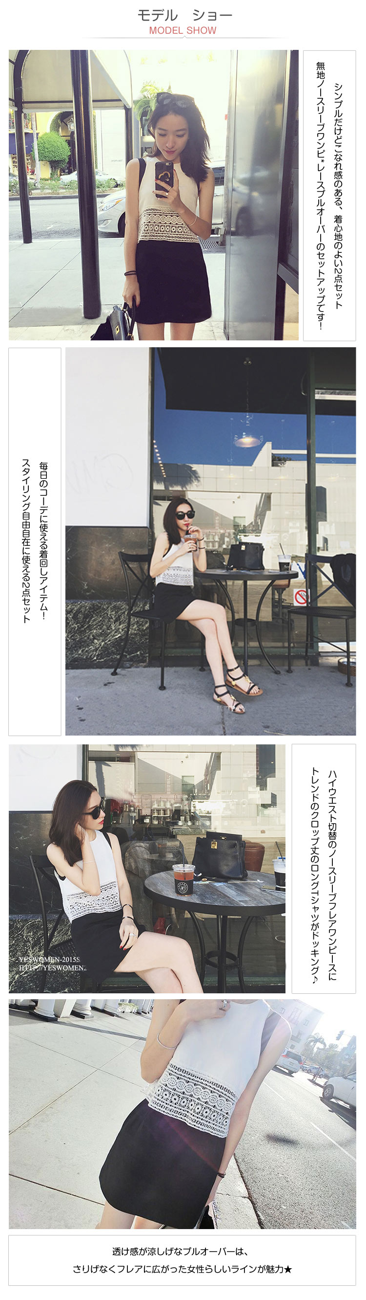 | シンプルだけどこなれ感のある、着心地のよい2点セット無地ノースリーブワンピ*レースプルオーバーのセットアップです!毎日のコーデに使える着回しアイテム!スタイリング自由自在に使える2点セットハイウエスト切替のノースリーブフレアワンピースにトレンドのクロップ丈のロングTシャツがドッキング?透け感が涼しげなプルオーバーは、さりげなくフレアに広がった女性らしいラインが魅力★ゆとりのあるシルエ&素材の落ち感がリラックスした着心地で、コーデにも取り入れやすい★それぞれ単品でも使えるお得アイテムは毎日着たくなる一枚です★ | |