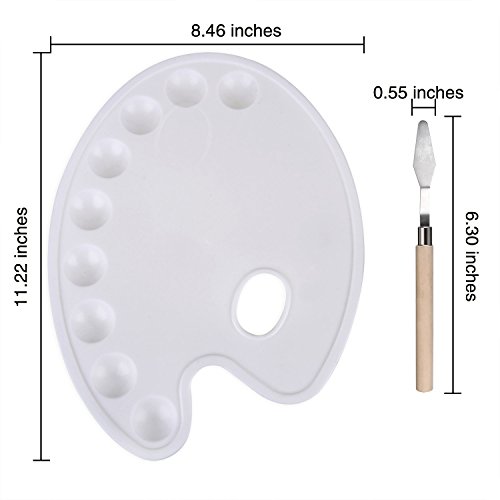 -. Feature : Paint tray and palette knife size: the paint tray dimension is 28.5 x 21.5 cm/ 11.22 x 8.46 inches; Palette knife tool size is 16 x 1.4 cm/ 6.30 x 0.55 inches / Palette material: artist painting trays are made of white plastic, not easy to corrosion, smooth surface, easy to wash and clean; Knife tool is made of wood and metal, durable / Easy to use: 9 wells can separate pigments in different colors, large mixing area in pallet allows you mix pigment easily, thumbhole makes it convenient for you to hold / Wide range of applicable people: these plastic palettes with palette knife tool are good and useful for painters, fine artists, crafts, hobbyists or art students, etc. / Quantity: 2 pieces of painting trays and a palette knife tool, artist palette combo, suitable for spreading, smoothing, smudging, mixing for watercolor, oil, pigment